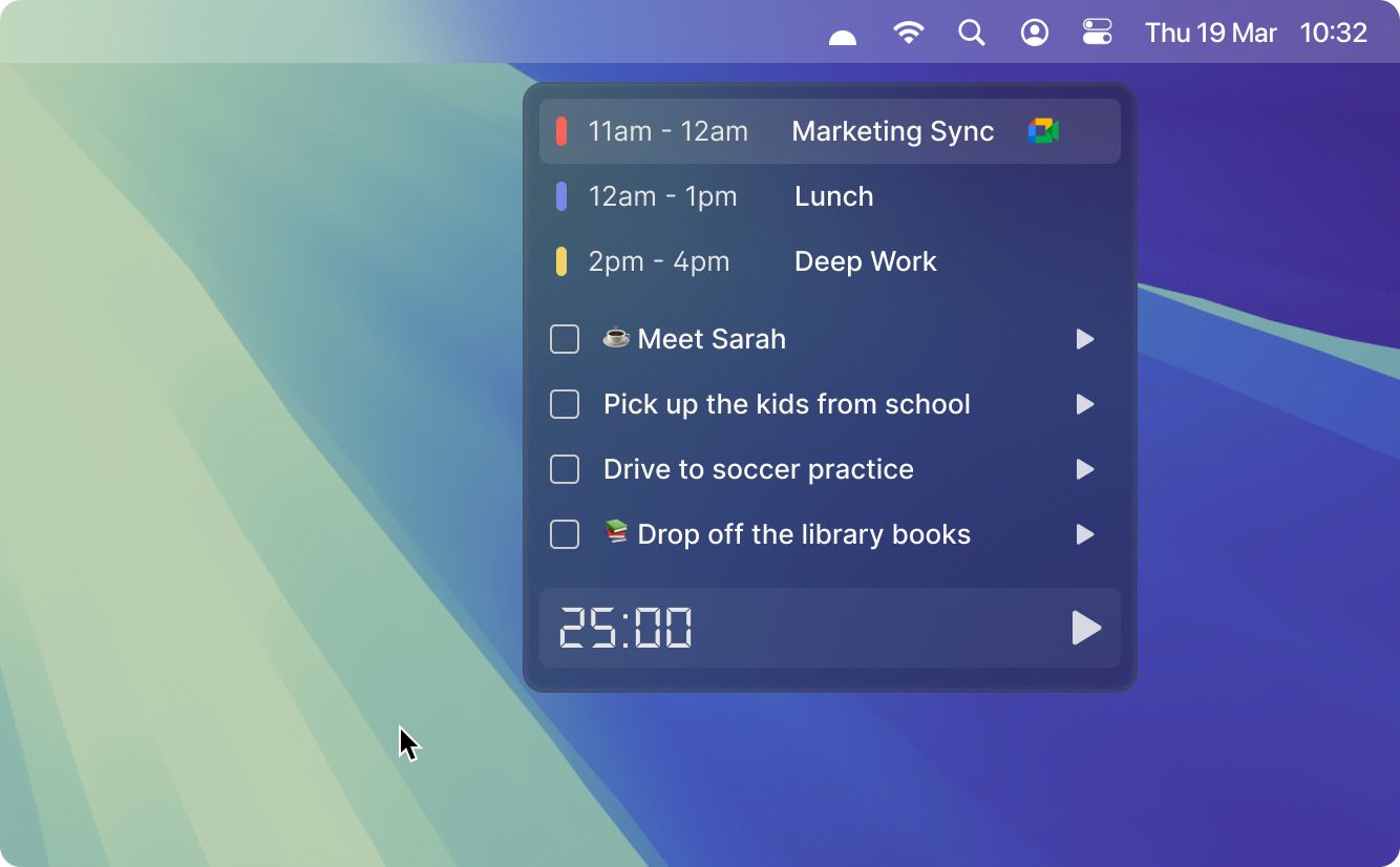 The widget, if clicked displays the events and tasks of the day along with task-specific timers that record the time spent in your calendar and a special Pomodoro timer.