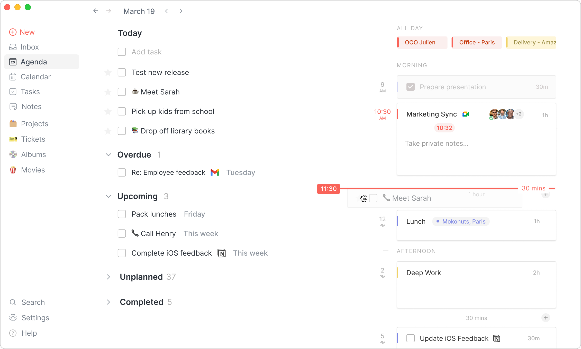 The Agenda has been reworked to improve re-planning your day. It now features sections for overdue, upcoming and unplanned tasks.