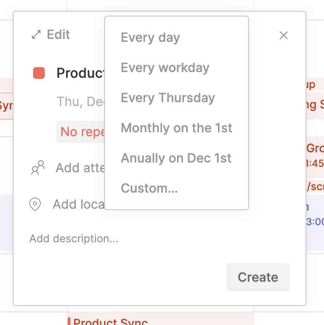 Events can now be created in full screen by clicking the Edit button in the creation pop-up window