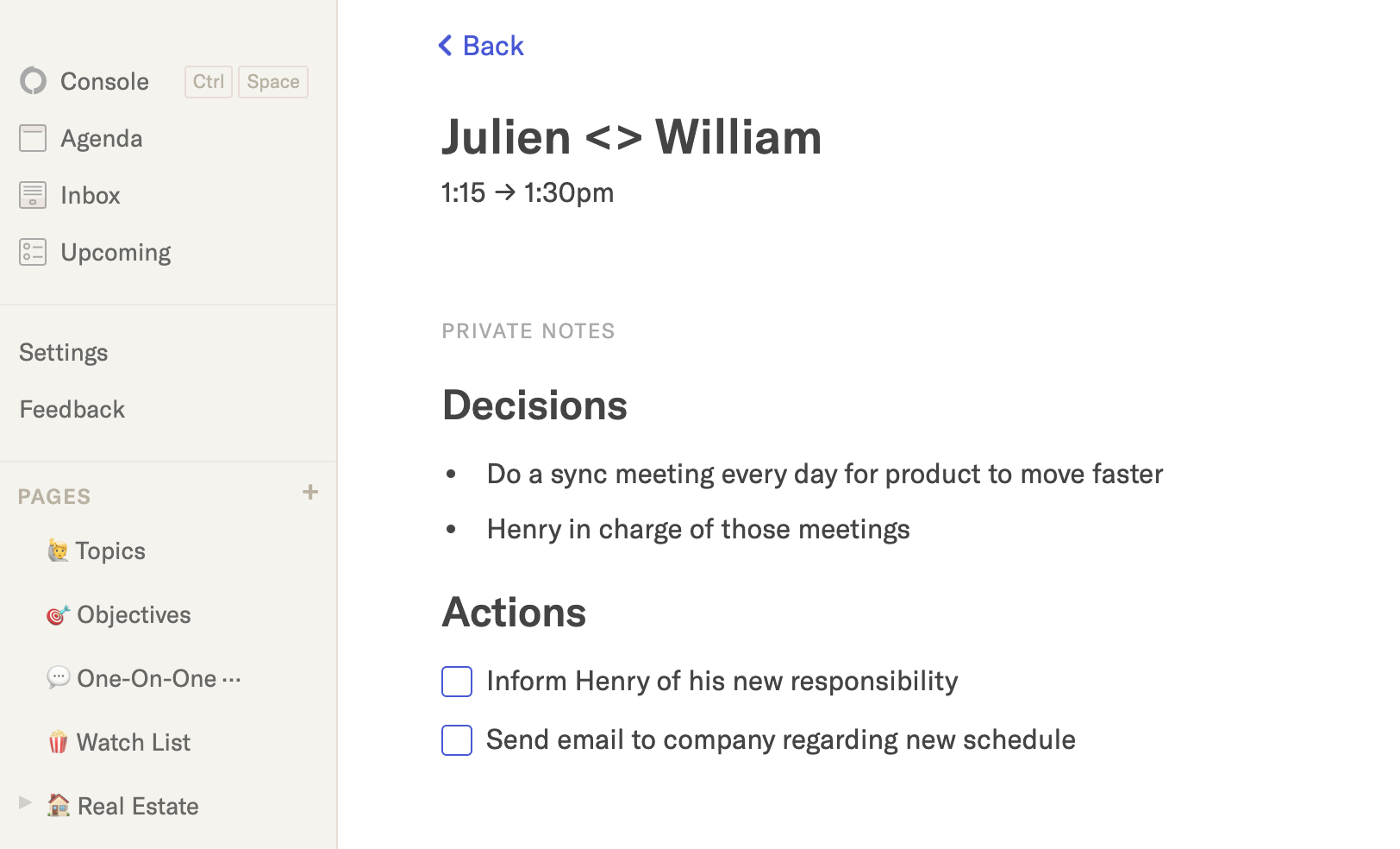 We've just introduced the last link between tasks, notes and time; you can now click on a meeting in the Agenda view and type private notes that will be linked to the event and its participants. In the future Routine will even resurface notes from previous meetings and more.
