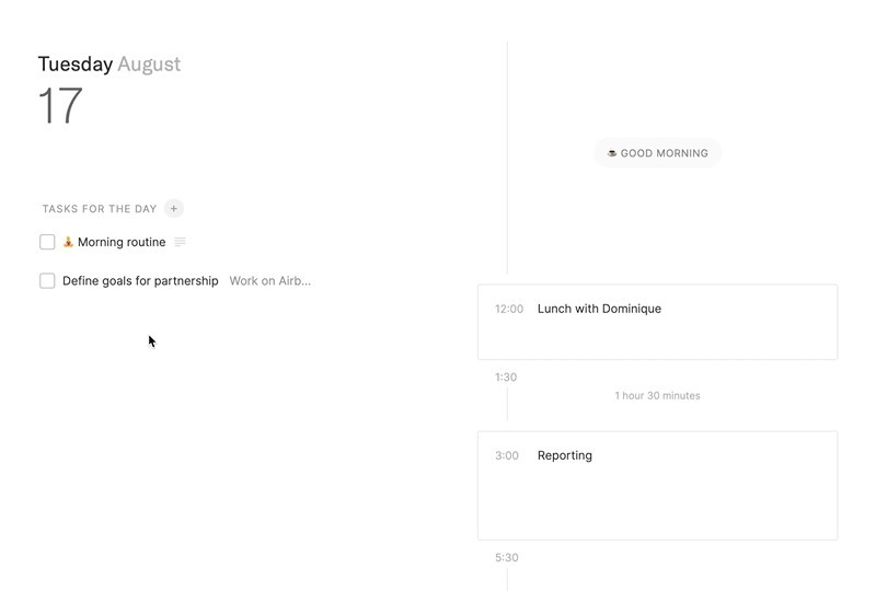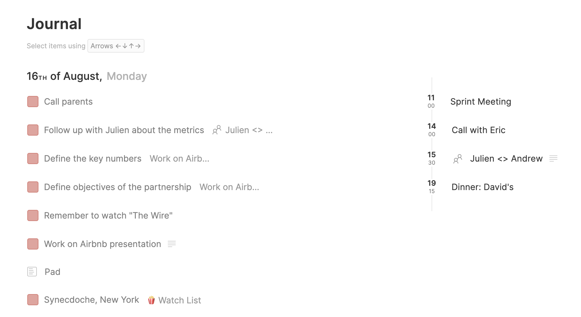 • The newly introduced journal allows you to access your past activity, from archived tasks and pages but also past events. This is particularly useful for accessing notes taken in a past meeting for instance. But it as useful for restoring a task or page that has been archived by mistake.